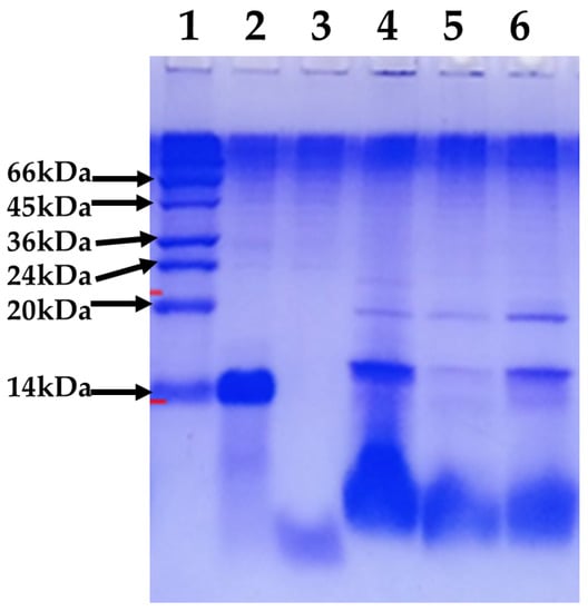 Gum was immediately frozen and stored a −20 °C, until use. Gum solutions were sterilized by autoclaving 15 min at 15 lb and 120 °C, after which they were vortexed for gum homogenization. For protein bands analysis, samples were homogenized in a test-tube homogenizer, with 5 mL of buffer (50 mM Tris-HCl, pH 8.0) per gram of sample, at 4 °C. Samples included (a) supernatant from strain liquid cultures, gum dissolved in isopropanol 1:1, and strain mycelium and (b) gummous material dissolved in isopropanol 1:1 and sonicated (five pulses/40 W/30 s) with or without mycelium, and molecular size markers. Once homogenized, samples were centrifuged for 5 min at 12,000× g and 4 °C. The resulting pellet was discarded and supernatant was processed for immediate analysis. We then performed SDS-PAGE to detect protein products bands from Hirsutella citriformis. Samples were mixed with loading buffer and electrophoresed at a constant 35 mA at 4 °C, after which gel was stained in 0.1% Coomassie brilliant blue R-250 in 30% (v/v) methanol and 10% (v/v) acetic acid, was distained in these solvents (to show protein bands) and interpreted for protein size [].