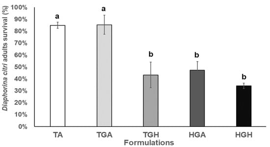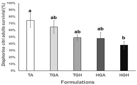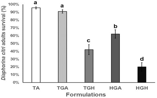 Diaphorina citri adults’ survival percentage average in laboratory bioassay after Hirsutella citriformis formulated conidia application by spraying. Absolute control = TA, Acacia gum control = TGA, Hirsutella gum control = TGH, formulation with Acacia gum = HGA, formulation with Hirsutella gum = HGH, the Hirsutella gum control (TGH) presented a mortality of 57.8%. Different letters indicate significant statistical differences, and bars indicate the standard error of the mean (Tukey test).
