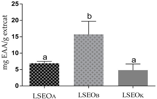 Ferric reducing antioxidant power of LSEOA, LSEOB, and LSEOK in mg of equivalent ascorbic acid/g of extract (values not sharing a common letter differ significantly at p < 0.05).