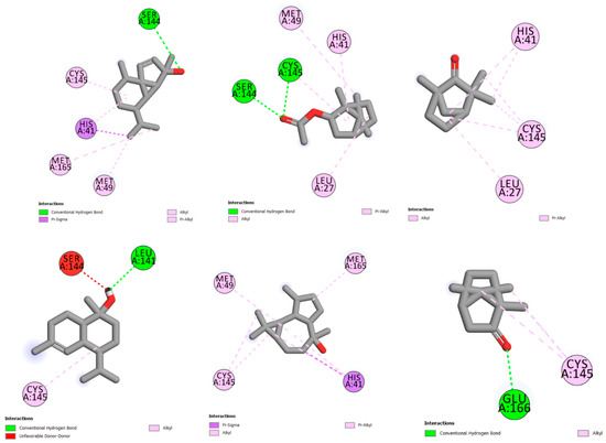 Essential oils have shown promise as antiviral agents against several pathogenic viruses [58,59]. To gain structural insights and understand the binding mode of molecular structures and protein targets, we applied molecular docking processes that were previously described as an efficient in silico approach [60]. Various experiments revealed that EOs could contribute to preventing the entry of SARS-CoV-2 into the human body and investigated the efficacy of EO compounds in the prevention and treatment of COVID-19 [31,59,61,62,63]. Da Silva et al. used molecular docking analysis to determine the interaction of 171 essential oil components with SARS-CoV-2, showing that the compound with the best-normalized docking score to SARS-CoV-2 Mpro was the sesquiterpene hydrocarbon (E)-β-farnesene [64].