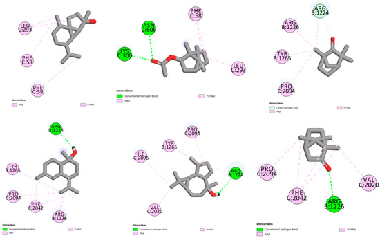 The molecular docking of compounds with the spike glycoprotein (pdb:6vsb) receptor presented in Figure 5 shows pi-alkyl interactions between bornyl acetate and LEU C:293 and PHE C:58 and PHE C:59 residues, with a score of 3.55 (−5.53 with Chimera Vina). The compound cubebol is stabilized by two hydrogen bond interactions, with ASN C:606 and LYS C:300 residues. In addition, the presence of pi-alkyl interactions increases the stability of this compound in the receptor pocket, with a score of 3.37 (−5.6 with Chimera Vina). L-fenchone is stabilized by pi-alkyl interactions, with a score of 2.54 (−4.8 with UCSF Chimera). The three compounds tau-muurolol, viridiflorol, and camphor show a hydrogen bond interaction with the ARG B:1224 residue for the two first compounds and with the ARG B:1226 residue for camphor.