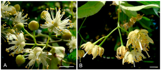 Inflorescences of two Tilia species: (A) Tilia cordata; (B) Tilia platyphyllos. Scale bars = 0.5 cm (A,B).