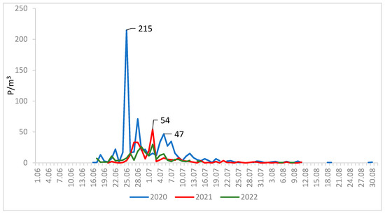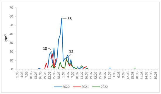 The maximum concentrations of lime pollen grains were much higher in Lublin (on average 100 P/m3) than in Szczecin (on average 29 P/m3) (Figure 3 and Figure 4). In 2020, the maximum pollen concentrations in both cities substantially exceeded the values obtained in the other two years. The maximum concentration of pollen grains in 2020 was 215 P/m3 (25 June) in Lublin and 58 P/m3 (30 June) in Szczecin (Table 1).