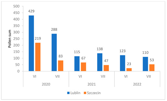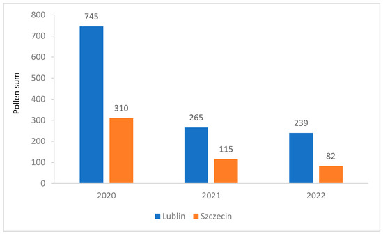 Similarly, the annual pollen sums were over twofold higher in Lublin (on average 416) than in Szczecin (on average 169). The highest annual pollen sums were recorded in 2020 in both Lublin (745) and Szczecin (310) (Table 1, Figure 5).