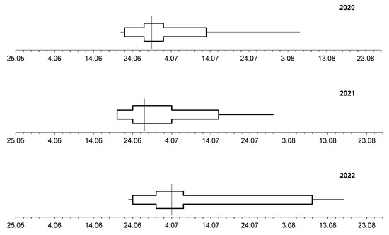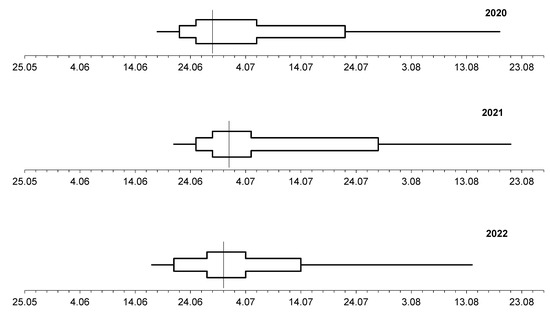 In Lublin and Szczecin, 50% of the annual airborne Tilia pollen sum was reached during the last 10 days of June. An exception was noted in Szczecin in 2022, where this value of the parameter was recorded during the first 10 days of July. During the study years, the stages with cumulative pollen grain percentages ranging from 25% to 75% had different lengths in both cities (Figure 7 and Figure 8). This indicated variations in the length of the phase of release of large amounts of lime pollen. This phase had the longest duration in Lublin in 2021 and in Szczecin in 2022.
