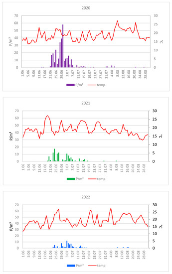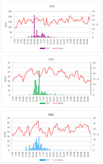 The following supporting information can be downloaded at: https://www.mdpi.com/article/10.3390/plants12061415/s1, Table S1: The list of Spearman’s correlations between the daily pollen count and meteorological factors in Lublin and Szczecin (2020–2022).