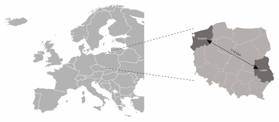 The lime pollen concentration in the air was measured in Lublin and Szczecin (Poland) in 2020–2022 (Figure 11). The temperate climate of the Lublin region exhibits a clear influence of continental air masses. The mean annual air temperature in Lublin in 1961–2020 reached 7.8 °C, and the mean annual precipitation sum was 591 mm [56]. Western Pomerania, where Szczecin is located, is characterized by a temperate climate with prevailing western, northwestern, and northern winds. The multitude of water reservoirs and the large forest area contribute to the high air humidity in this region. The mean annual air temperature in Szczecin in 1961–2020 was reported to reach 9.0 °C, and the mean annual precipitation sum was 547 mm [56].