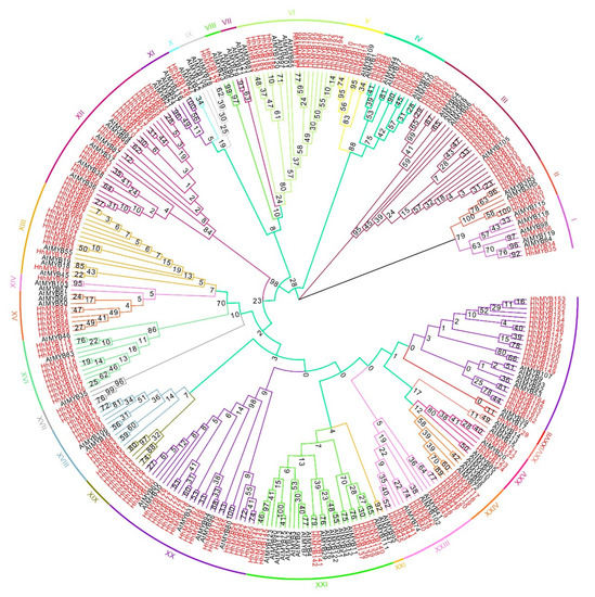 In order to analyze the phylogenetic relationships of HhMYBs, a phylogenetic tree was constructed from their predicted coding sequences. MYBs of A. thaliana (AtMYBs) were included for comparison (Figure 1). The candidate HhMYBs and AtMYBs were clustered within 28 subfamilies but showed differing clustering patterns among the subfamilies, suggesting the divergence of the MYB family during the evolution of these species. The XX subfamily had the most HhMYBs (22), whereas the XIV and XXVII subfamilies each contained only one member, and VII, VIII, X, XXII, and XXVI subfamilies contained no HhMYBs. It is worth noting that several MYB subfamilies were found to contain a greater number of HhMYBs relative to AtMYBs. For example, the III subfamily contains 20 HhMYBs but only 5 AtMYBs. Conversely, some subfamilies consisted exclusively of AtMYBs, indicating that these genes may be lost during the evolution of H. hamabo.