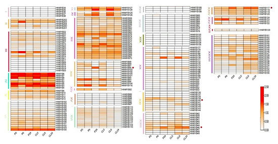 Expression pattern of MYB genes in H. hamabo under salt and drought stress as determined from RNA-Seq data. The expression level was represented by color: red, higher expression; white, lower expression. HhMYBs with a dot were specifically mentioned in the manuscript. P0, P6, P24, CL0, CL6, and CL24 represent treatments for 0 h, 6 h, and 24 h under PEG treatment and 0 h, 6 h, and 24 h under NaCl treatment, respectively.