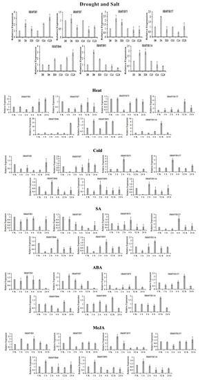 The expression profile data for expression analysis of H. hamabo in different periods of salt and drought treatment were obtained from RNA-Seq data [22]. Fragments per kb per million reads (FPKM) were used as the standard for expression pattern, and the omicshare tool was used to generate the associated heatmap figures (https://www.omicshare.com/tools/Home/Soft/heatmap, accessed on 18 March 2021).
