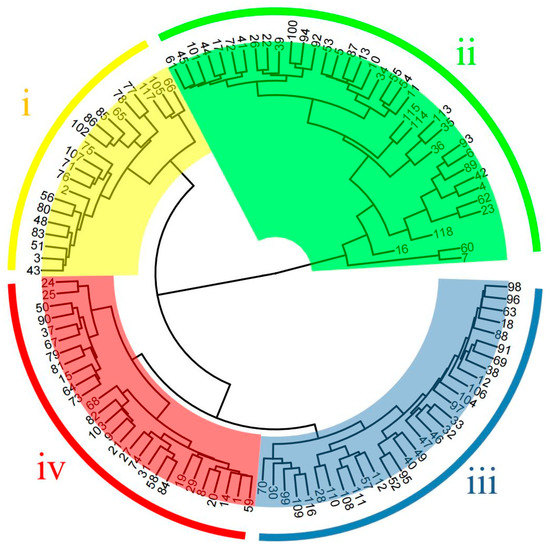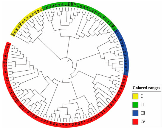The coefficient of variation values of the 16 morphological traits of the test materials ranged from 11.11% to 60.38% (Table 1), among which the coefficient of variation values of the five traits, namely single cone weight, cone shell thickness, single nut weight, stigma length, and single kernel weight, were all higher than 30%. In addition, the coefficient of variation values of all morphological traits was in the range of 20%−30%, except for the minimum value of 11.11% for fruit shape index. Cluster analysis of phenotypic traits was performed based on the mean values of phenotypic trait data of the test materials (Table S1), and the results of the analysis divided 118 Castanea plant materials into four groups (Figure 1), namely Taxon I, Taxon II, Taxon III, and Taxon IV. Taxon i included 21 materials, Taxon II included 38 materials, Taxon III included 31 materials, and Taxon IV included 28 materials.