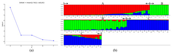 Optimal K-value according to maximum Delta K (a) and population structure analysis of 118 Castanea plant materials (b). The optimum number of groups is 3, dividing the 118 ingredients into three groups (A, red; B, green; C, blue). The labels on the bottom of (b) represent the material number (corresponding to Table S4).