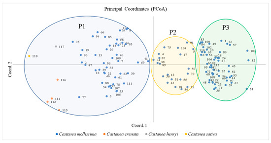 The PCoA can directly reflect the relationship between the Castanea and plant species. The distance between species is related to genetic similarity. Proximity refers to a high genetic similarity and close kinship. Distance indicates low genetic similarity, long kinship, and large genetic differences. A PCoA of 118 Castanea plant species was performed using the first and second principal components as the horizontal and vertical coordinates, respectively (Figure 4), on which 118 Castanea plant species were divided into three taxa, namely P1, P2, and P3. Taxa P1 included 49 chestnut plant materials of four species including Chinese chestnut, Japanese chestnut, Henry chestnut, and European chestnut; taxa P2 included 20 Chinese chestnut materials, and Taxon P3 included 49 Chinese chestnut materials. In addition, the distribution of the Chinese chestnut species taxa was scattered, indicating that the tested Chinese chestnut species resources have high diversity.