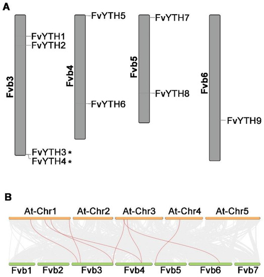 The locations and synteny analysis of strawberry FvYTH genes. (A) The locations of FvYTH genes in forest strawberry chromosomes. The chromosome number is indicated at the left of each chromosome. Gene pairs from tandem duplications are marked with *. (B) The synteny genes between strawberry and Arabidopsis. The red lines indicate the synteny gene pairs of YTH genes.