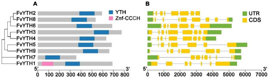Gene structures and conserved domains of FvYTH proteins. (A) Conserved domains in FvYTH proteins. Pink box represents the Znf-CCCH domain, and blue boxes represent the YTH domain. (B) Exon/intron organizations of FvYTH genes. Yellow boxes represent exons, and gray lines represent introns. The upstream/downstream regions of FvYTH genes are indicated in green boxes.
