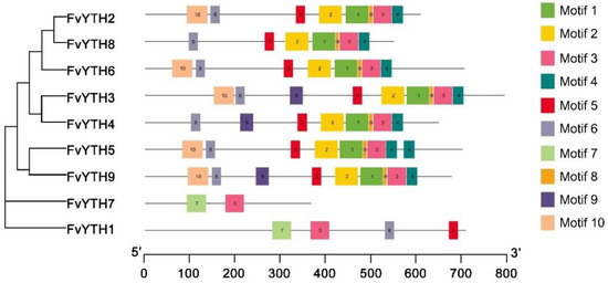 Distributions of conserved motifs in FvYTH proteins. Ten putative motifs are indicated in different colored boxes.