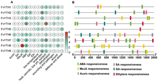 The cis-elements analysis of promoters in FvYTH genes. The 2 kb DNA fragment upstream of the initiation codon of each FvYTH gene was analyzed using the online software PlantCARE. (A) The number of cis-elements related to hormones and stress in each FvYTH promoter. (B) The distribution of hormone-response elements in the FvYTH gene promoters.