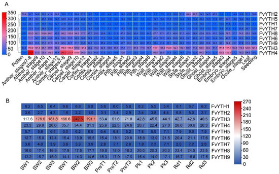 FvYTH gene expression changes in flowers, achenes, receptacle development, and leaves and seedlings were obtained from the gene expression database of strawberry (https://bar.utoronto.ca/efp_strawberry/cgi-bin/efpWeb.cgi (accessed on 22 February 2023)). The expression levels of FvYTH genes from white fruits to the ripening stage were obtained by analyzing previously published RNA-Seq data [43]. The accession number of raw RNA-Seq data is PRJNA522346. Transcripts per million (TPM) values were visualized using the heatmap function of TBtools [39].