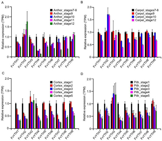 Expression trends of FvYTH genes in different stages of organ development. The expression trends of FvYTH genes in different development stages of anther (A), carpel (B), cortex (C), and pith (D). The TPM value of the selected first stage was normalized as 1.