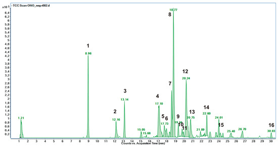 (HR) LC-ESI-QTOF MS/MS total compound chromatogram (TCC) of O. illyricum extract acquired in negative ion mode. Peak identification is given in Table 1.