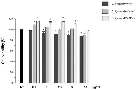 The effects of O. illyricum solution (2 mg/mL in DMSO) and O. illyricum liposomes/PG-PEVs were examined on cell viability, after proper dilution of samples to reach the concentrations of 0.1, 1, 2.5, 5 and 10 µg/mL. To this end, HaCaT cells were treated with the O. illyricum samples for 24 h and the viability was investigated using the MTT test. The results indicated that none of the samples were cytotoxic in HaCaT cells. A slight decrease in viability was observed in the cells exposed to the O. illyricum solution, reaching the lower value (87%) at the higher concentration (10 μg/mL) (Figure 2). On the other hand, an increase in viability was observed in the cells exposed to the O. illyricum nanoformulations in the 0.1–5 μg/mL concentration range.
