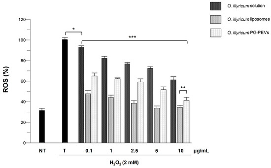Inhibition of H2O2-induced ROS generation (1 h-incubation with 2 mM H2O2) by O. illyricum solution and O. illyricum liposomes/PG-PEVs in HaCaT cells. NT, non-treated cells; T, cells treated with H2O2 only. *** Values statistically different (p < 0.0001) from each other and from cells treated with H2O2 only (T), with the exceptions of 0.1 μg/mL O. illyricum solution vs. cells treated with H2O2 only (* p < 0.05) and 10 μg/mL O. illyricum liposomes vs. PG-PEVs (** p < 0.005).