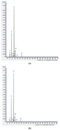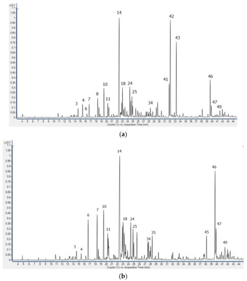GC-MS total ion chromatogram of sea fennel hydrolates obtained hydro-distillation (a) and microwave-assisted hydro-distillation (b). Peak assignment is given in Table 2.