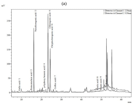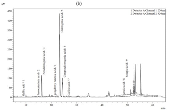 HPLC chromatogram of residual wastewater extracts after essential oil extraction by hydro-distillation (a) and microwave-assisted hydro-distillation (b). Peak assignment is given in Table 3.