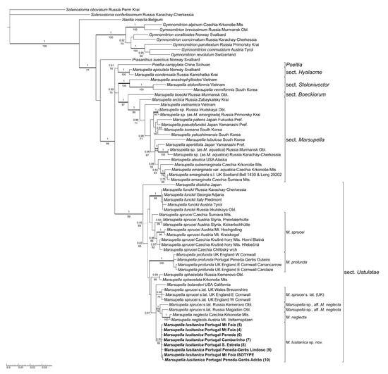 Consensus tree from the Bayesian inference of concatenated ITS and trnF–trnT data, partitioned between ITS and trnF–trnT nucleotide data and standard data from indels coded by a simple coding method [19]. Accessions of Marsupella lusitanica are printed in bold. Support values representing posterior probabilities from Bayesian analysis are plotted above branches, while bootstrap support values from Maximum Likelihood analysis of the equally partitioned dataset appear below branches. Support values are shown only on branches receiving either PP > 0.9 or BS > 70. Branches which received maximum support from at least one of the analyses and accessions of Marsupella lusitanica appear in bold.