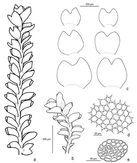 - Schuster, R.M. The Hepaticae and Anthocerotae of North America; Columbia University Press: New York, NY, USA; London, UK, 1974; Volume III. [Google Scholar]