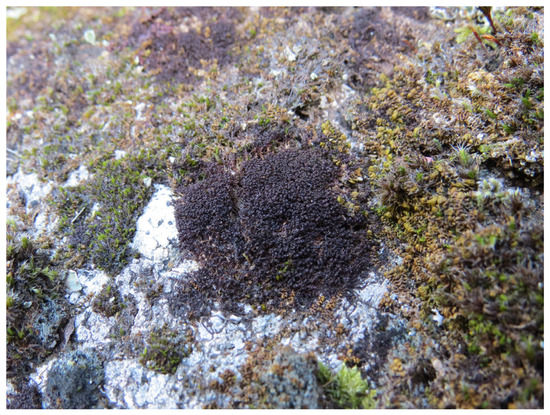 The habitat of the newly described species has been explored in detail only in Serra de Monchique. Here, Marsupella lusitanica occurs on a natural dome-shaped outcrop of syenite blocks and on an old terrace stone wall constructed from syenite rock on the north-facing flank of the mountain. It grows closely appressed to rock, typical of a pioneer species and characteristic of the genus [21]. At the type locality, only female plants have been detected. It occurs at several points, albeit in a small quantity, around the more humid base and lower levels of a north-facing ‘tor’ or outcrop at 876 m altitude (Figure 6), on exposed crustose and foliose lichen-covered rock surfaces and in shallow fissures (Figure 6 and Figure S4) typically mixed with Grimmia trichophylla Grev., Hypnum cupressiforme Hedw., Scapania compacta (Roth) Dumort., Racomitrium heterostichum (Hedw.) Brid., Cephaloziella divaricata (Sm.) Schiffn., Frullania tamarisci (L.) Dumort., Cynodontium bruntonii (Sm.) Bruch & Schimp. and, more rarely, Frullania fragilifolia (Taylor) Gottsche, Lindenb. & Nees. Marsupella emarginata is also present. The hyperoceanic microclimate of this outcrop is evidenced by the presence of the Cisto crispi–Ulicetum minoris gorse formation in which the lower woody stems of Cistus salvifolius L. support a rich epiphytic bryophyte community including Antitrichia curtipendula (Hedw.) Brid., Ulota calvescens Wilson and several Orthotrichum species [38]. However, significantly, also on the same outcrop is Racomitrium lanuginosum (Hedw.) Brid., a species in the circumpolar boreo-arctic montane element [39]. The other known locality (sites of paratypes 4, 5) on Serra de Monchique for M. lusitanica is ca. 1 km to the east on the north side of Fóia, at 784–792 m a.s.l., where it grows in at least two places on old neglected terraced north-facing moss-covered walls of syenite (Figure S5), partially overgrown by vegetation (Crataegus monogyna Jacq., Pteridium aquilinum (L.) Kuhn, Rhododendron ponticum subsp. baeticum (Boiss. & Reut.) Hand.-Mazz., Rubus ulmifolius Schott). This is the only site where male plants were detected; the majority of plants examined are female. Marsupella emarginata also occurs on the same wall. Much less detail is known about other sites in Portugal where the species was not collected intentionally, either supposed to be M. sprucei (DB’s collections from Peneda-Gerês) or M. funckii (J.K.’s collections from Peneda-Gerês, Serra da Estrela and Serra do Caramulo). In all three sites from the more northern Portuguese localities, the species was noted on vertical faces of granitic stones (either natural or from stone walls) in sheltered, moderately humid situations.
