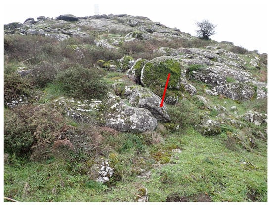 North-facing syenite rock outcrops on the summit of Fóia, Serra de Monchique, type locality of Marsupella lusitanica, one of the micropopulations (paratype 3) arrowed. Photo by R.D. Porley, 19 January 2023.