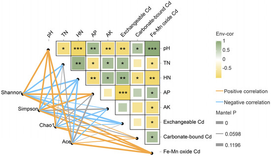 Correlation network between soil physicochemical indices and alpha diversity indices. The color block size in the correlation heatmap indicates the absolute value of the correlation coefficient. *, **, and *** represent 0.01 < p < 0.05, 0.001 < p < 0.01, and p < 0.001, respectively. Orange and blue network lines indicate significantly positive and negative correlations (p < 0.05), respectively.
