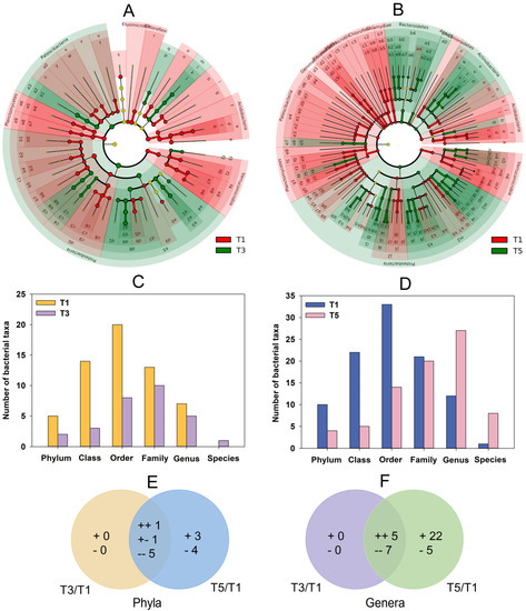 Linear discriminant analysis (LDA) and effect size analysis (LDA scores > 3) showing the indicator bacteria in rhizosphere soils of C. grandiflora supplemented with 0 (T1), 2 (T3) and 8 (T5) g kg−1 GABA. (A) Cladogram showing dominant bacteria between T1 and T3 soils. Identifiers labelled on the cladogram correspond to those in Supplementary Table S6. (B) Cladogram showing dominant bacteria between T1 and T5 soils. Identifiers labelled on the cladogram correspond to those in Supplementary Table S7. (C) Numbers of dominant bacteria at different taxonomic levels between T1 and T3 soils. (D) Numbers of dominant bacteria at different taxonomic levels between T1 and T5 soils. (E) Venn diagram of the differential bacterial phyla between T3 and T5 soils compared to the T1 soil. (F) Venn diagram of the differential bacterial genera between T3 and T5 soils compared to the T1 soil.
