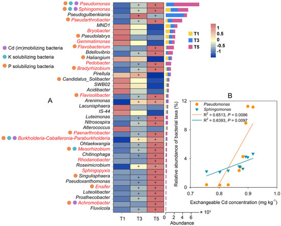 Dynamic heatmap and stacked graph showing the enriched bacterial genera (A) and correlation analysis between relative abundance of bacterial taxa and soil exchangeable Cd concentration (B) in C. grandiflora rhizosphere soils supplemented with 2 (T3) and 8 (T5) g kg−1 GABA compared with the control soil (T1). The relative abundances of bacterial genera in the graph are normalized at the row level of the heatmap. The plus (+) sign indicates the rhizobacteria enriched in the T3 and/or T5 soils. Bacterial genera in red font indicate plant growth-promoting rhizobacteria, and bacterial genera marked with purple, green, and orange circles indicate rhizobacteria involved in Cd mobilization/immobilization, K solubilization, and P solubilization, respectively.