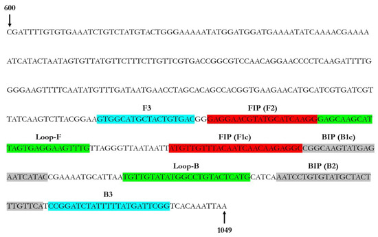 In order to design a LAMP primer set, the AV1 sequence of ToLCNDV Trapani1703 was used for the PrimerExplorer version 5 software (http://primerexplorer.jp/lampv5e/, accessed on 10 December 2022) as a reference sequence. A specific 450 bp nucleotide inside the AV1 gene was chosen as the amplification target. The primer set selected included a total of six primers: two external primers (forward outer primer F3 and backward outer primer B3), two internal primers (forward inner primer FIP and backward inner primer BIP), and two additional loop primers (forward loop primer LF and backward loop primer LB); the presence of loop primers significantly improve the efficiency, sensitivity, and selectivity of the reaction, reducing the time it takes by 50% [37]. In order to evaluate possible cross-reactions with other organisms, the specificity of each primer obtained was verified in silico using the Nucleotide-BLAST algorithm (BLASTn tool) (https://www.ncbi.nlm.nih.gov, accessed on 10 December 2022) available at the National Centre for Biotechnology Information (NCBI). Moreover, to verify the primer set affinity, each primer was tested using the Vector NTI Advance 11.5 software (Invitrogen, Carlsbad, CA, USA) against the full genomic sequences of the following geminiviruses: Tomato yellow leaf curl virus (TYLCV) (GenBank Acc. No. X15656), TYLCV-IL23 (GenBank Acc. No. MF405078), TYLCV isolate 8–4/2004 (GenBank Acc. No. DQ144621), Tomato yellow leaf curl Sardinia virus (TYLCSV) (GenBank Acc. No. GU951759), Potato yellow mosaic Panama virus (DNA-A GenBank Acc. No. NC_002048, DNA-B GenBank Acc. No. NC_002049), Tomato leaf curl Sinaloa virus (DNA-A GenBank Acc. No. NC_009606, DNA-B GenBank Acc. No. NC_009605), and Tomato yellow mottle virus (DNA-A GenBank Acc. No. KC176780, DNA-B GenBank Acc. No. KC176781).