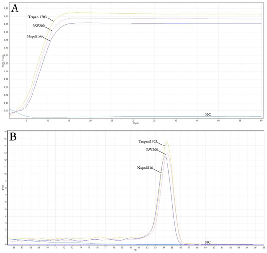 The real-time LAMP assay was conducted using the DNA extracted from the three samples previously analysed by end-point PCR, including a healthy zucchini squash plant DNA as a negative control (NC), to evaluate the performance of the primer set designed for ToLCNDV detection. As reported in Table 3 and Figure 2A, the amplification curves of positive samples reached the plateau in about 15 min. The melting curves of the positive real-time LAMP reactions displayed the same peak temperature of approximately 84.5 °C (Figure 2B). According to the end-point PCR results, no signal was obtained with the negative control (NC), even at late reaction times, as expected.