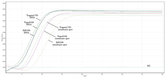 In detail, the three isolates resulted as positive in the LAMP assay when extracted with either procedure. Specifically, isolates extracted with the commercial kit and the “membrane spot crude extract” method showed a fluorescence increase ranging from 4 to 5.1 min and from 6.1 to 8.6 min, respectively, while the reaction plateau was reached in about 10 minutes and about 13–19 min, respectively. Lastly, no amplification was obtained with the negative control, even with this rapid procedure, as expected.