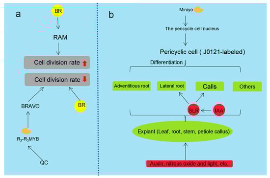 Effects of plant growth regulators. Note: (a) The effect of BR and transcription factor s on cell division rate. (b) Different plant tissues are differentiated from pericycle cells or induced by plant hormones. Yellow represents exogenous hormones, red represents exogenous hormones.