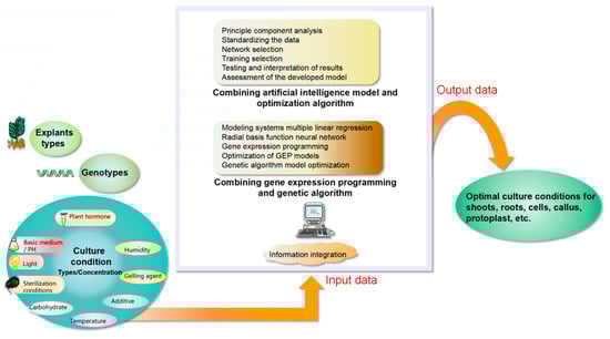 In order to successfully and efficiently carry out plant tissue culture, we need to scientifically improve the culture conditions including light, temperature and humidity, appropriate medium composition, plant growth regulators, etc. However, the cultivation of plants of different species and different tissues of the same plant has great differences. It is very tedious and inefficient to screen the most suitable culture conditions through the experiments. For example, in the prediction of a medium formula, the mineral and hormone composition of the plant micropropagation medium is an important factor in the growth of explants, but the different plant species lead to different nutritional and hormone requirements. Blindly testing the types and proportions of various hormones and minerals is time-consuming, laborious, and costly work, and does not often succeed. Most of the optimization of plant tissue culture medium is improved on the basis of previous experiments. This method requires a lot of control experiments. Second, it is also necessary to effectively develop and optimize the new medium. Understanding the role of minerals and hormones and their interaction with other medium components and different plant tissues is critical to the successful in vitro culture of plant tissues [73,74]. However, the relationship between medium components is very complex, and there are even many unknown interactions. It is difficult to optimize the medium for different plant species and genotypes. Therefore, the development and application of a predictive modeling system for medium formulation and culture conditions can improve the efficiency of culture optimization [74]. Data-driven modeling is considered as an effective alternative to optimizing biological processes and nonlinear multivariate modeling [75]. Modeling systems are often combined with optimization algorithms to improve efficiency. Appropriate modeling techniques can not only predict the value of the software sensor, but also estimate the probability [75]. In recent years, modeling technology has developed rapidly. Common systems include the combination of an artificial intelligence (AI) model and optimization algorithm (OA) [76], and the combination of gene expression programming (GEP) and genetic algorithm (GA) [5].