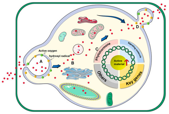 The process by which nano-elicitors act on plant cells. (A): The nano-elicitor increases reactive oxygen species and hydroxyl radicals, which can enhance the permeability of cell membranes. (B): The elicitor enters the cytoplasm and various organelles. (C): The elicitor stimulates intracellular hormones, related signaling molecules, key genes, and other components related to the synthesis of active substances, ultimately leading to an increase in the production of active substances. (D): Nano-elicitors are excluded from the cell by exocytosis.