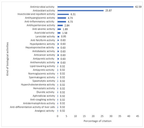 A total of 220 scientific studies on the biological activities of 269 medicinal plants were identified. Altogether, these studies cover 29 types of biological activities (Figure 1). The most explored are antimicrobial, antioxidant, insecticidal, antihyperglycemic, and anti-inflammatory activities.