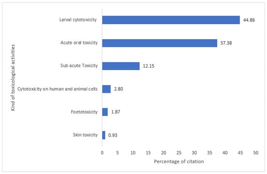 A total of 107 scientific studies have explored the toxicity of the medicinal plants identified. Most of the studies focused on larval cytotoxicity, followed by acute oral toxicity (Figure 2).