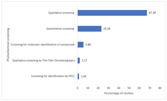 One hundred thirty-eight (138) phytochemical studies were identified among the published reports on medicinal plants. Most of them are related to the sole qualitative profiling by the method of staining and precipitation (Figure 3).