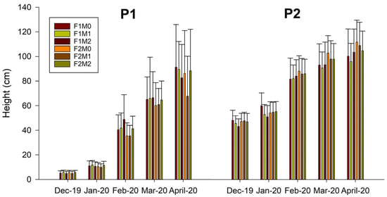 Shoot height of Nothofagus alessandrii plants of one and two seasons (P1 and P2) under different combinations of fertilization management (F1 and F2) and application of MFI (M0, M1, and M2).