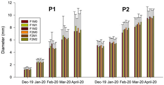 Shoot diameter of Nothofagus alessandrii plants of one and two seasons (P1 and P2) under different combinations of fertilization management (F1 and F2) and application of MFI (M0, M1, and M2).