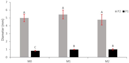 Cumulative increase in shoot diameter (mm) in N. alessandrii plants as a function of application of MFI (M0, M1, and M2) and plant type (P1 and P2). Different letters represent significant differences at p < 0.05.