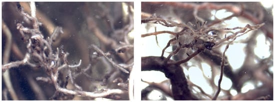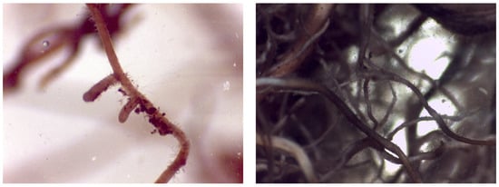 Figure 5 shows lateral fine roots of ruil inoculated with Thelephora terrestris, with reduced longitudinal growth, typical for ectomycorrhiza; however, in these roots, the root hairs still persisted, and there was no presence of mantle or Hartig net. This may represent an early stage of mycorrhiza formation.