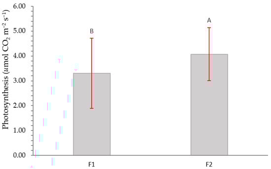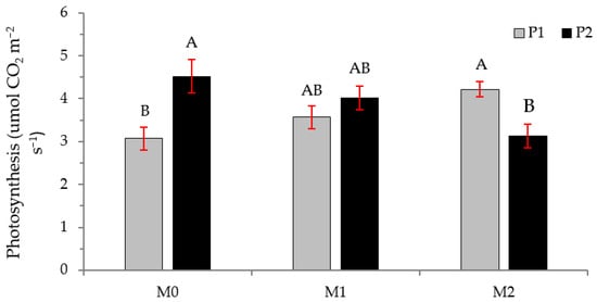 Regarding photosynthesis, Figure 6 shows photosynthesis depending on the type of plant and MFI treatment. Without MFI, P2 plants perform greater photosynthesis; this trend is reversed when the plants are inoculated with Hebeloma (M2), and there are no differences in photosynthesis when the plants are inoculated with Thelephora (M1).