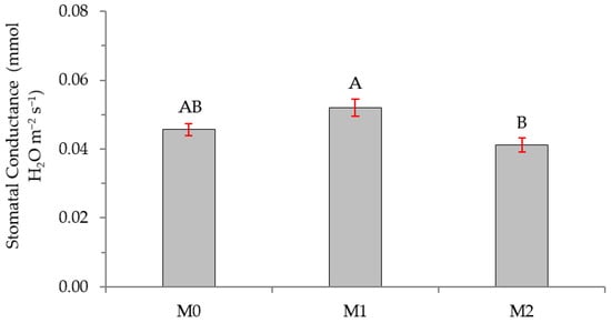 Stomatal conductance in Nothofagus alessandrii plants as a function of MFI treatment (M0, M1, and M2). Different letters represent significant differences at p < 0.05.